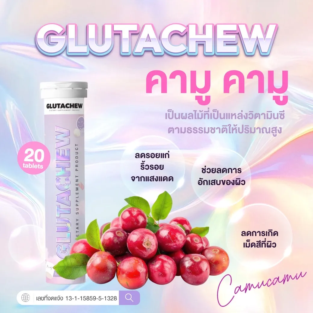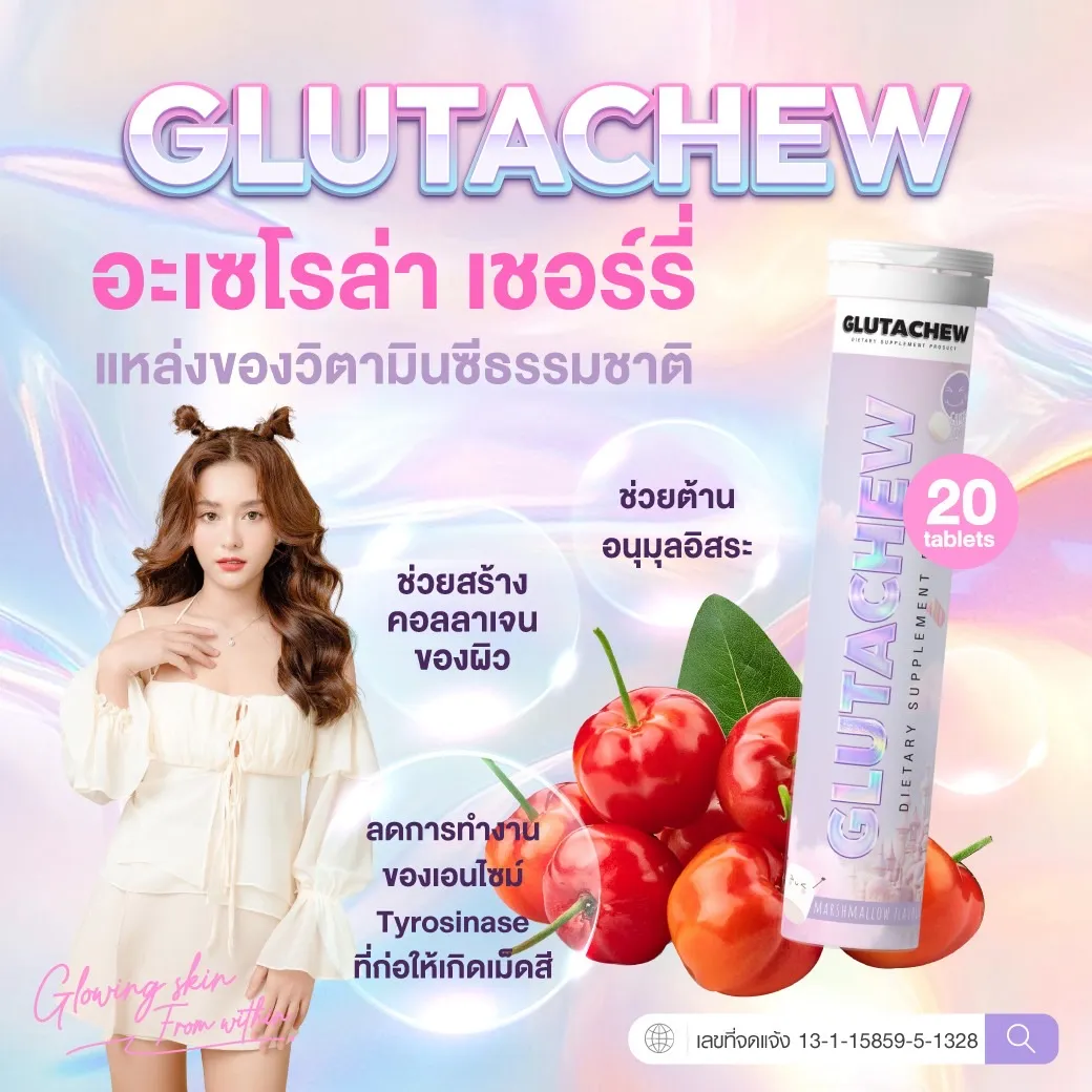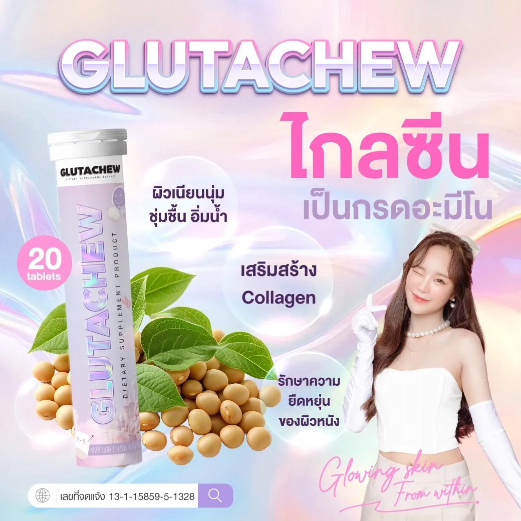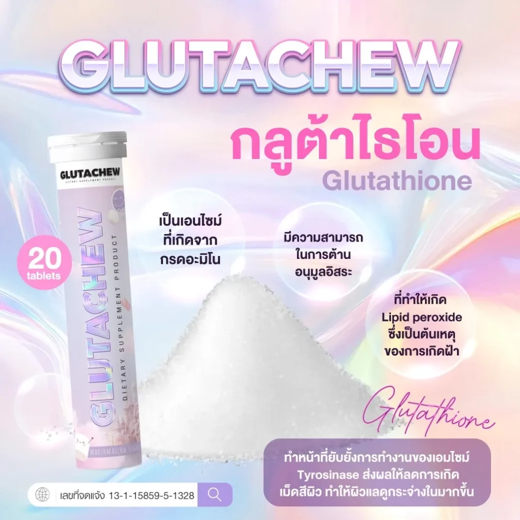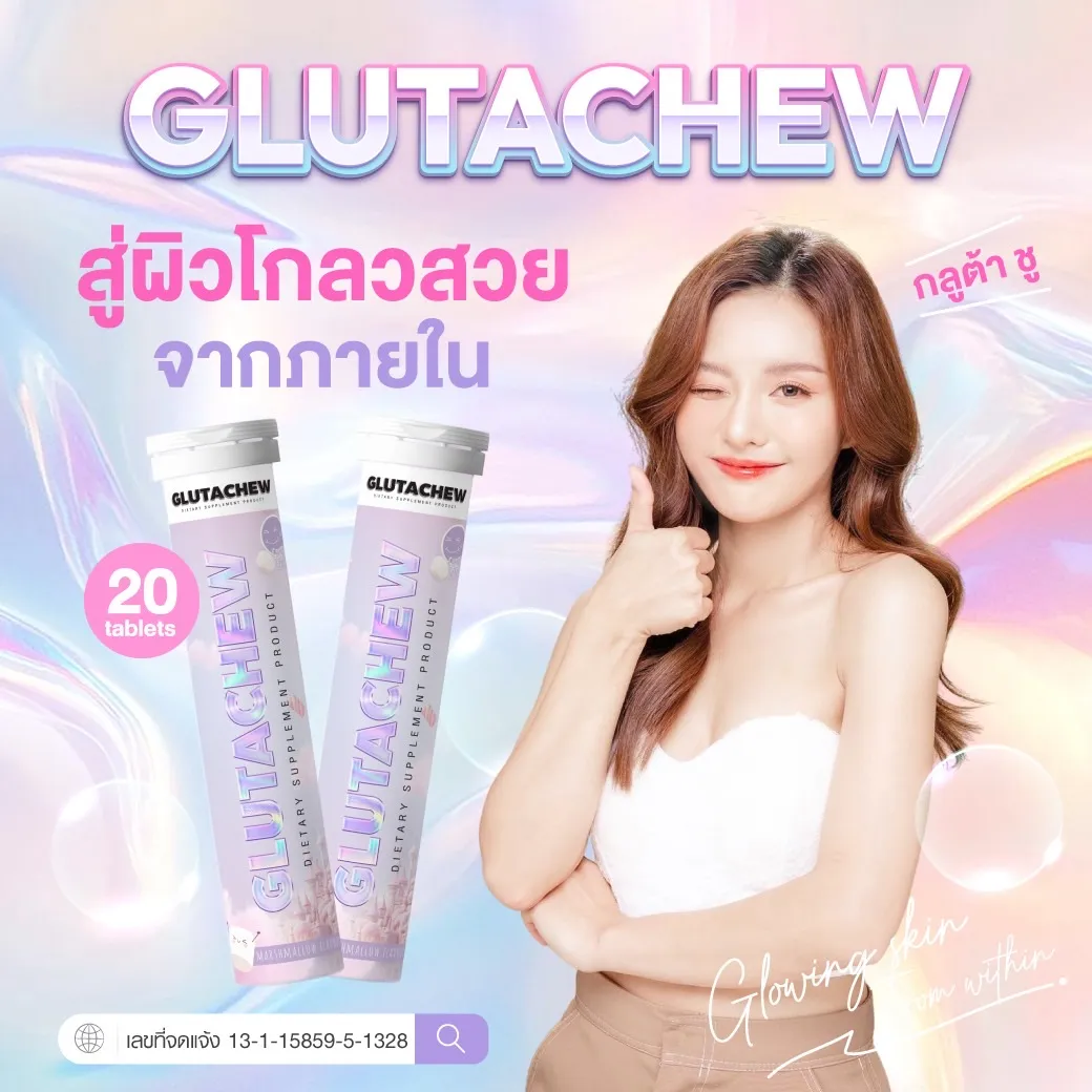 GLUTACHEW คือผลิตภัณฑ์เสริมอาหารที่ช่วยดูแลผิวพรรณจากภายในสู่ภายนอก ด้วยสารสกัดเกรดพรีเมียมที่มีคุณสมบัติในการต้านอนุมูลอิสระ เพิ่มความชุ่มชื้น เสริมสร้างคอลลาเจน และลดการเกิดเม็ดสีผิว ช่วยให้ผิวแลดูกระจ่างใสขึ้นอย่างเป็นธรรมชาติ